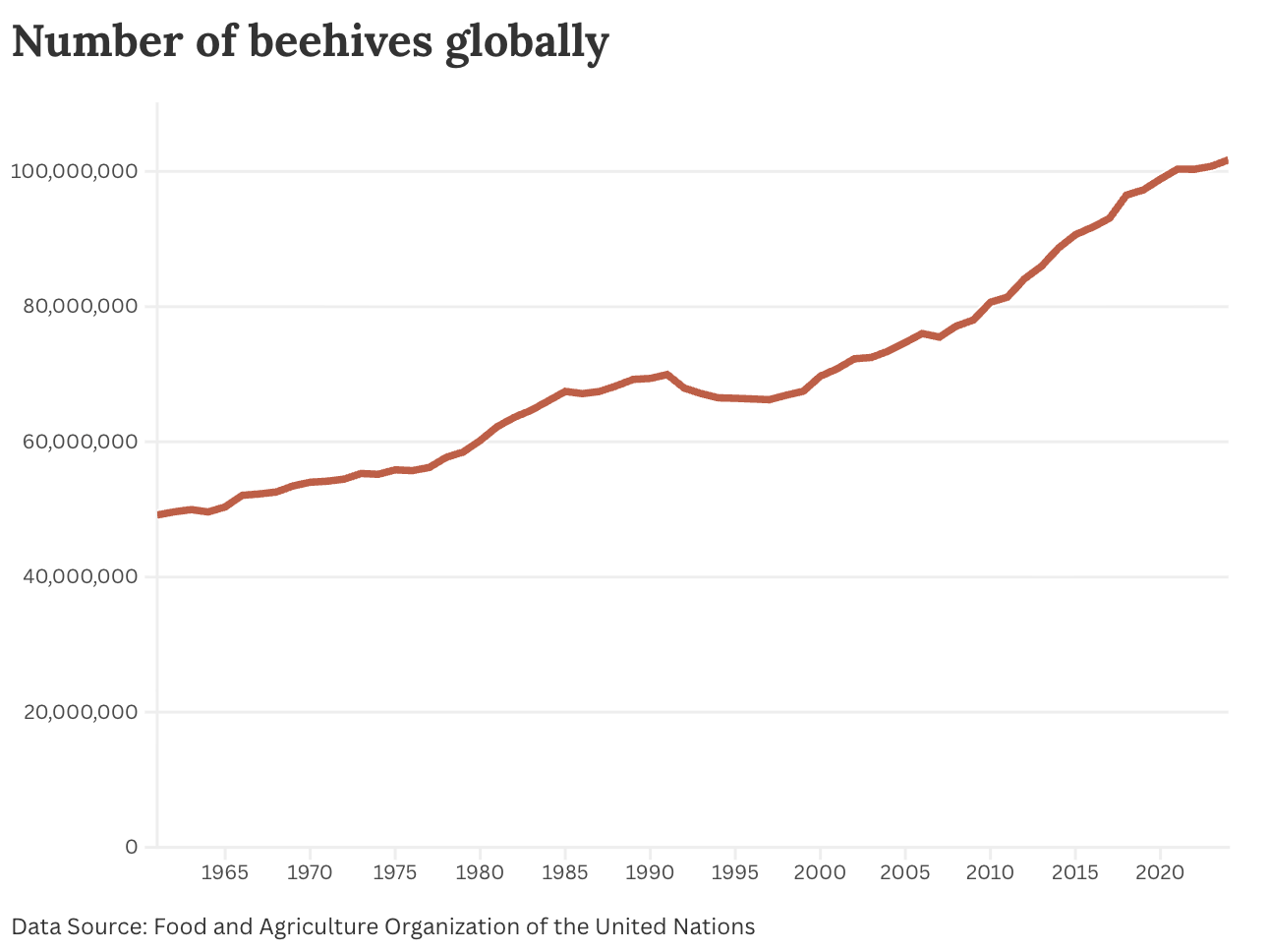 [Note that this is not true everywhere. There are fewer beehives in the United States than there were 50 years ago. I’ve plotted this data across selected regions here].