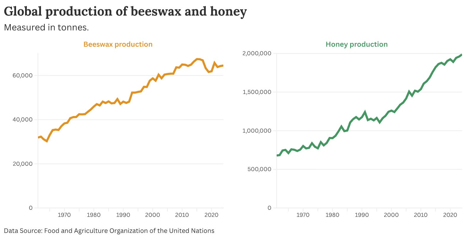 It’s true that managed honeybee populations are doing well overall.2 Hive numbers have risen over time, and global honey production has increased too.