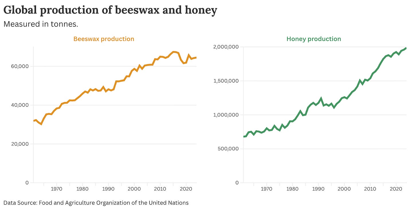 What this data shows is the number of honeybees (or, in this case, beehives, which are often used as a proxy for individual bees) that are farmed to produce honey and beeswax.1 They are, essentially, livestock.