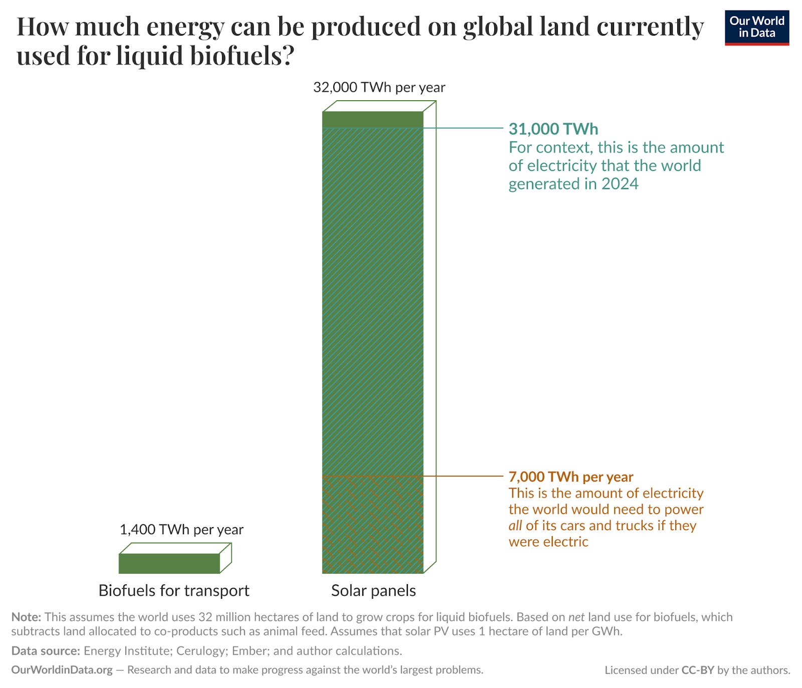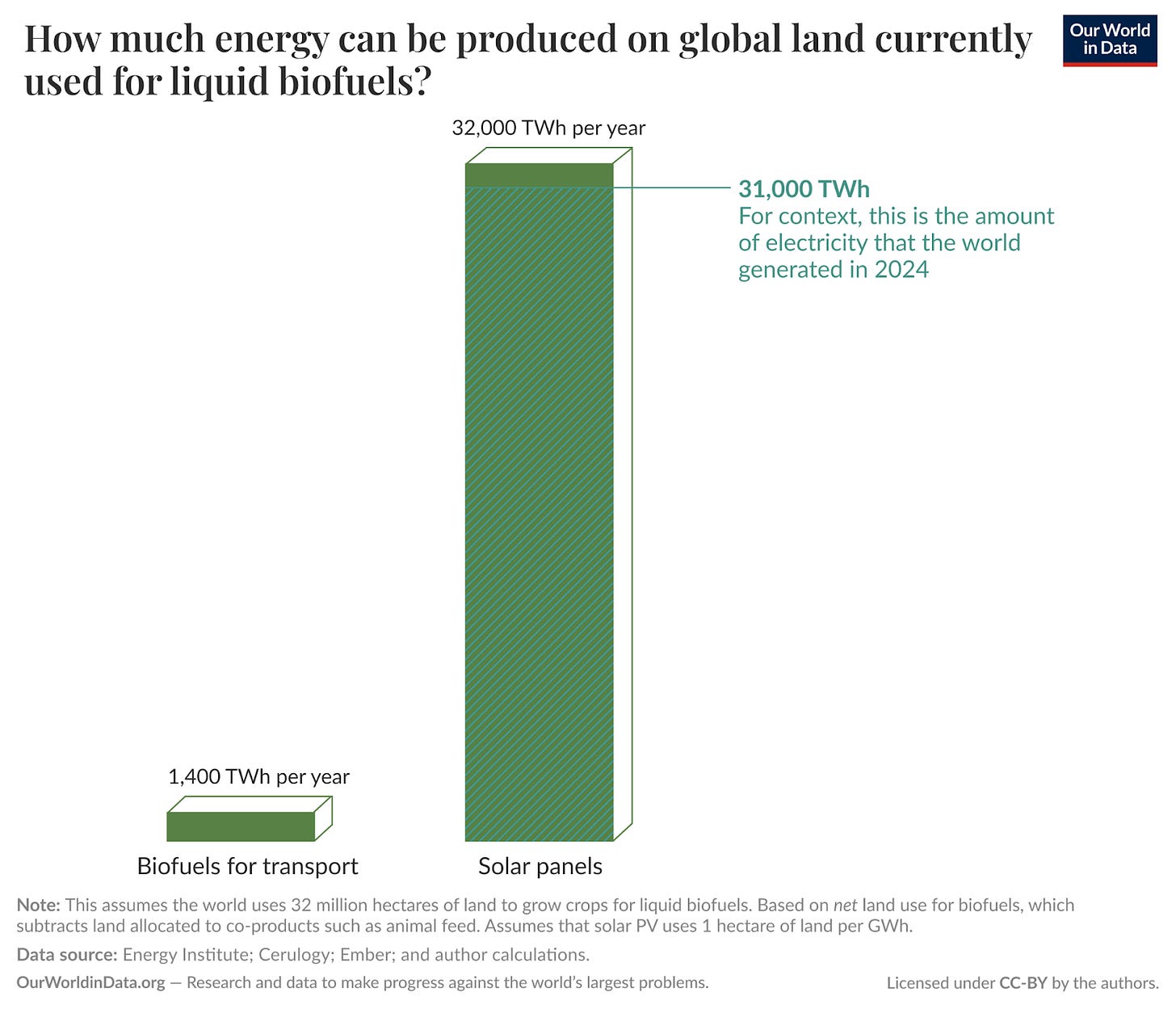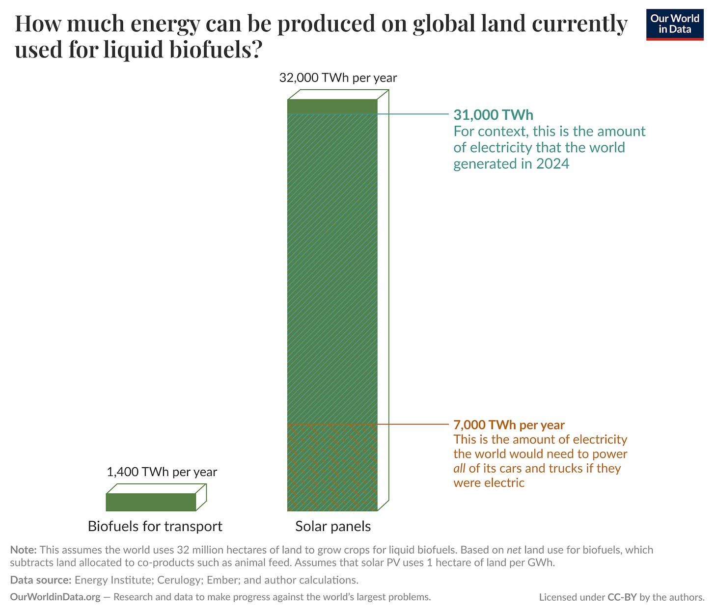 If we put solar panels on those 32 million hectares of biofuel land, we could generate around 32,000 terawatt-hours (TWh) of electricity. Incidentally, that’s the same amount of electricity as the world consumes in a year.