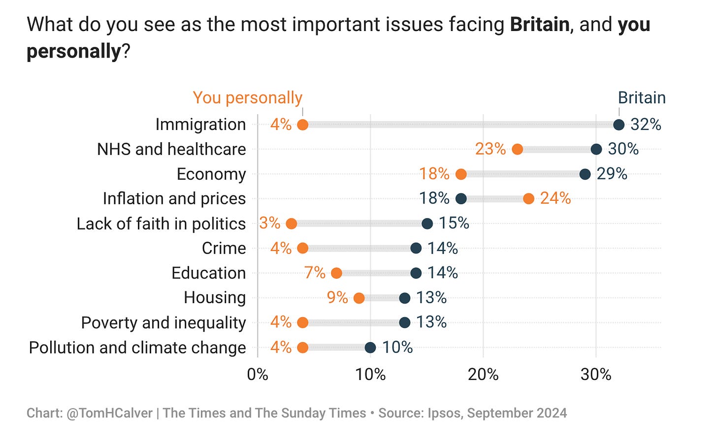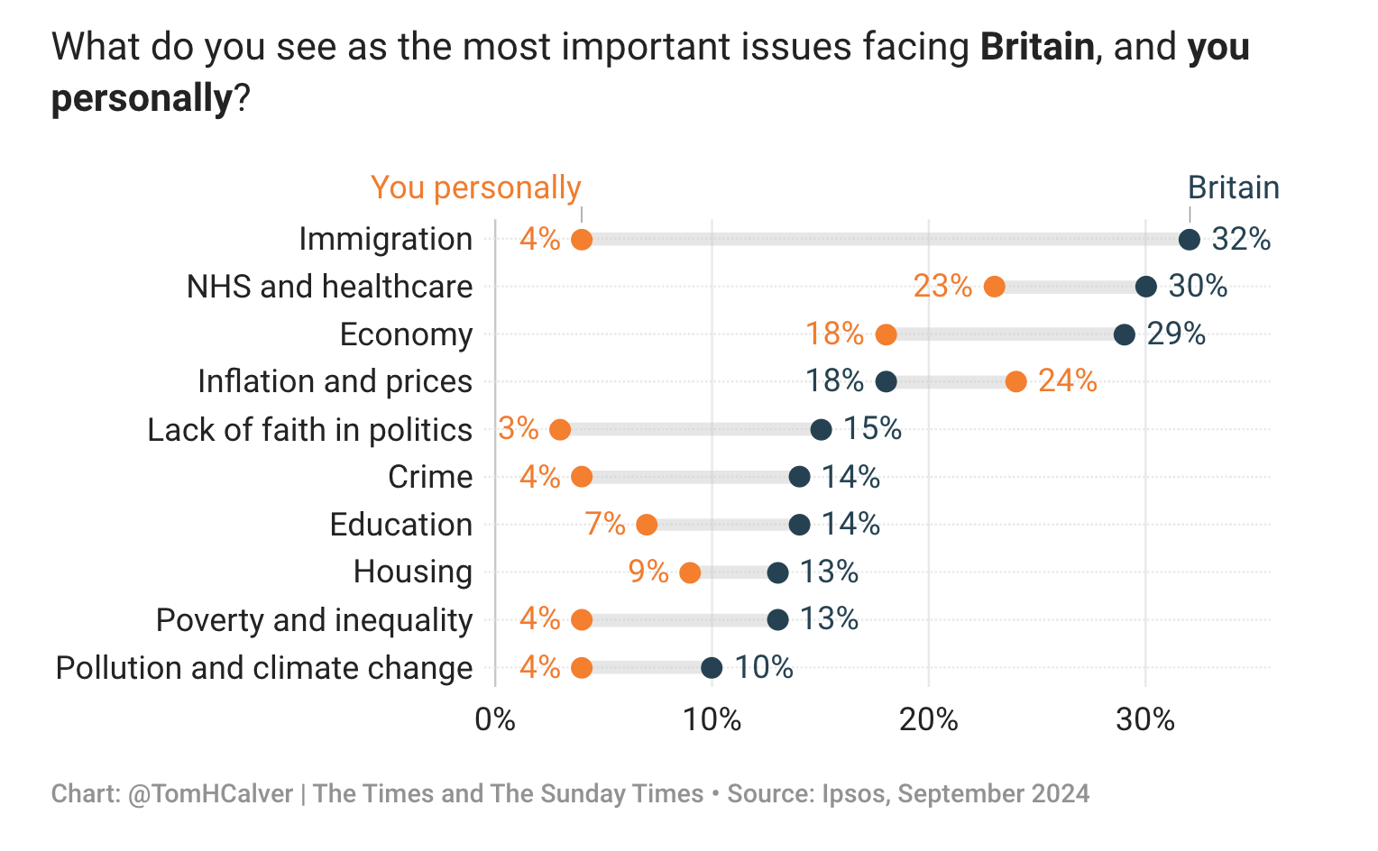 Finally, people are more likely to see problems as collective, not personal: they say an issue affects the country, but not them. As Tom Calver showed in The Times, on almost every issue, Brits were pretty shy about saying it was important to them personally.