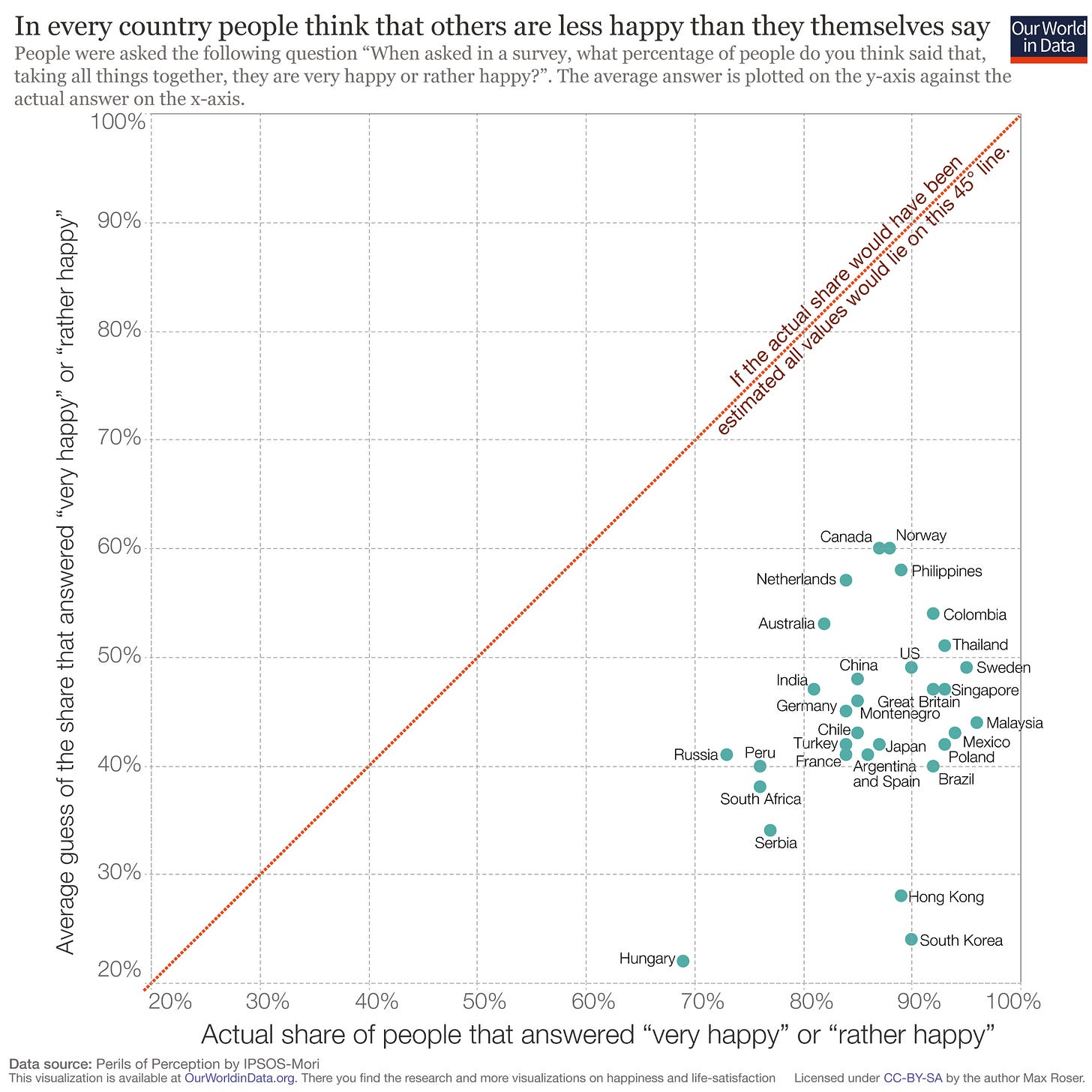 People consistently think that people in their country are less happy than they actually are. On the x-axis of the chart below, we have the share of people in each country who said they were “very happy” or “rather happy”. In most surveyed countries, it was the majority: often over 80% or 90%. On the y-axis, we have the average guess that people made about what share they thought would say they were very or rather happy. These guesses were far lower than reality. In South Korea, for example, people thought that only 25% of their fellow citizens were happy. In reality, 90% were. Since all the countries are below the orange dotted line, people tend to underestimate others’ happiness everywhere.