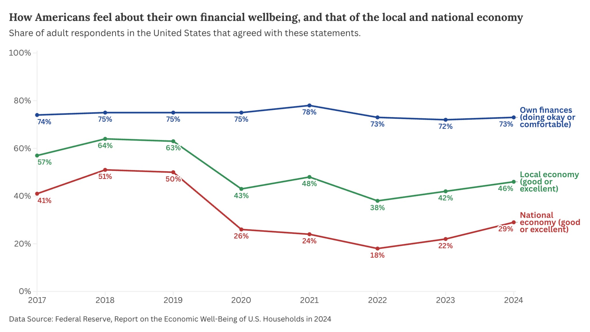 Three years ago, Derek Thompson published an article in The Atlantic titled ‘Everything Is Terrible, but I’m Fine’ on this exact theme. It was primarily focused on the United States, specifically the US economy. Survey data from the Federal Reserve consistently show that people tend to be relatively positive about their own financial well-being, less positive about the local economy, and even less so about the national economy. I’ve updated this chart to 2024, which you can see below.3